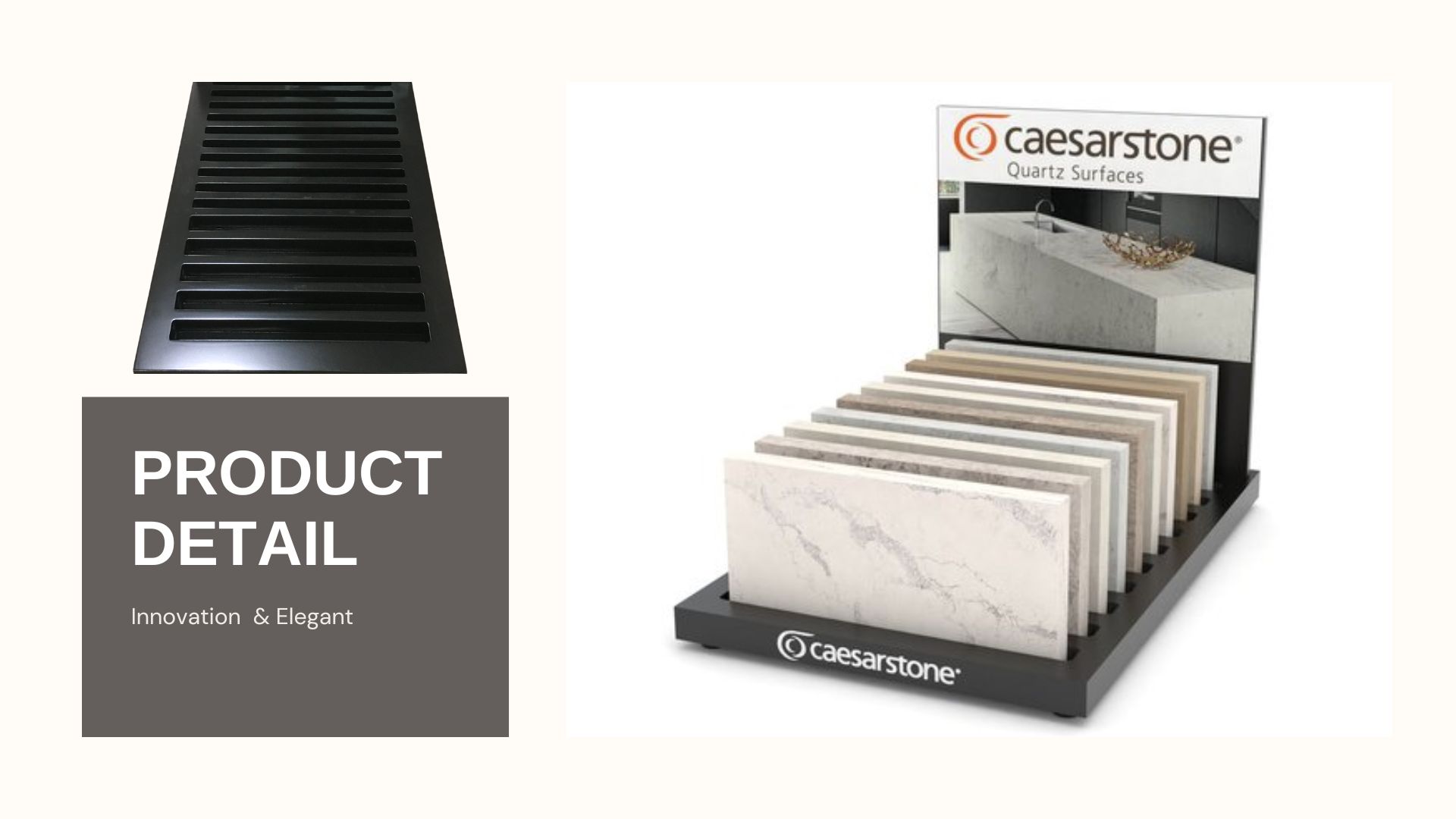 - Bahan berkualitas tinggi: The quartz stone counter display rack stand CD007 made of 30mm thickness MDF material with phigh-end powder coated surface. Customer’s logo can be print on the front or the back panel.