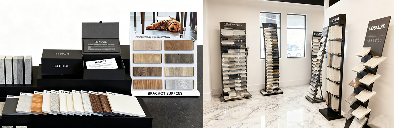 Eco Sample Display는 맞춤형 샘플 제시 솔루션의 모든 수단을 생성하고 개념화하는 데 특화되어 있습니다.: 석재 및 타일 샘플 디스플레이 도구,화강암 석재 디스플레이 랙 , 석재 카운터 디스플레이, 석영 타워 디스플레이 ,샘플 책, 샘플 케이스, Sampel Box, 서류 가방 표시, 여행 가방. 우리는 마케팅 도구를 위한 다양한 자료를 제공합니다. (금속, MDF, 판지, PP, PVC, 알류미늄…) .