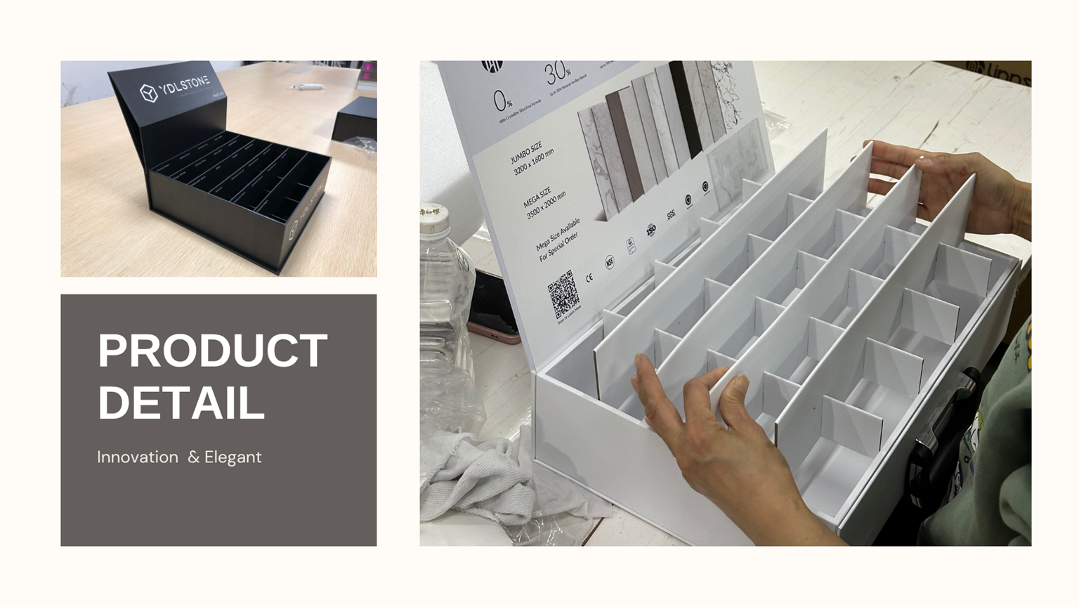 Building Material Sample Box design to display granite, marble, quartz stone, porcelain, ceramics, tiles, concrete and other architecutural materials. The sample box deisgn with rigid gride to collect several tile samples.