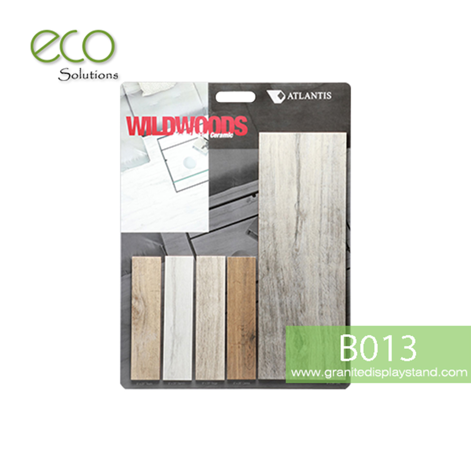 Flooring Sample Boards made of MDF panel with handle to carry flooring samples or showcase samples in the showroom display stand. Sample display boards are made of MDF with printing label are widely used for wood flooring, timber flooring, vinyl flooring, tile mosaic, ceramics, tiles, stone sample display in the showroom. We create the sample display boards according to your flooring swatches dimentions.