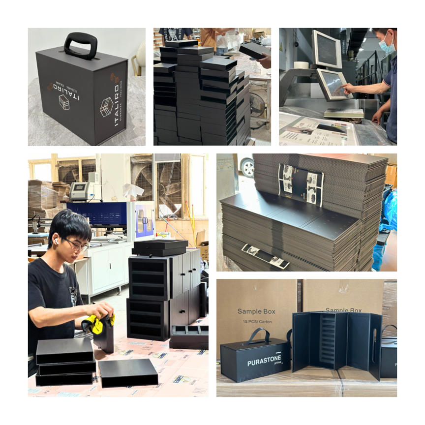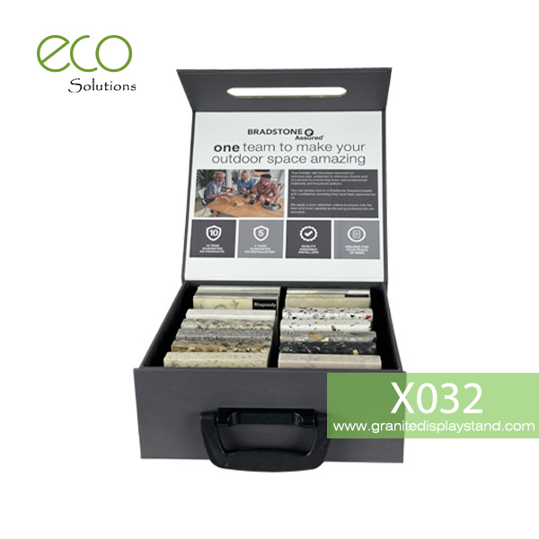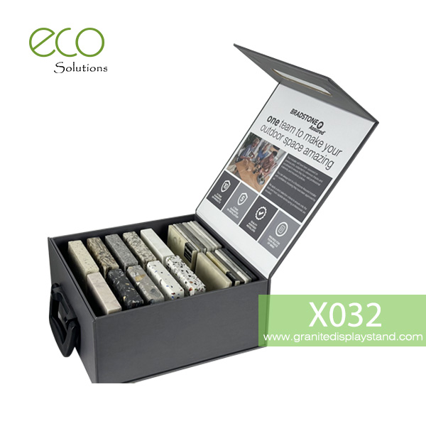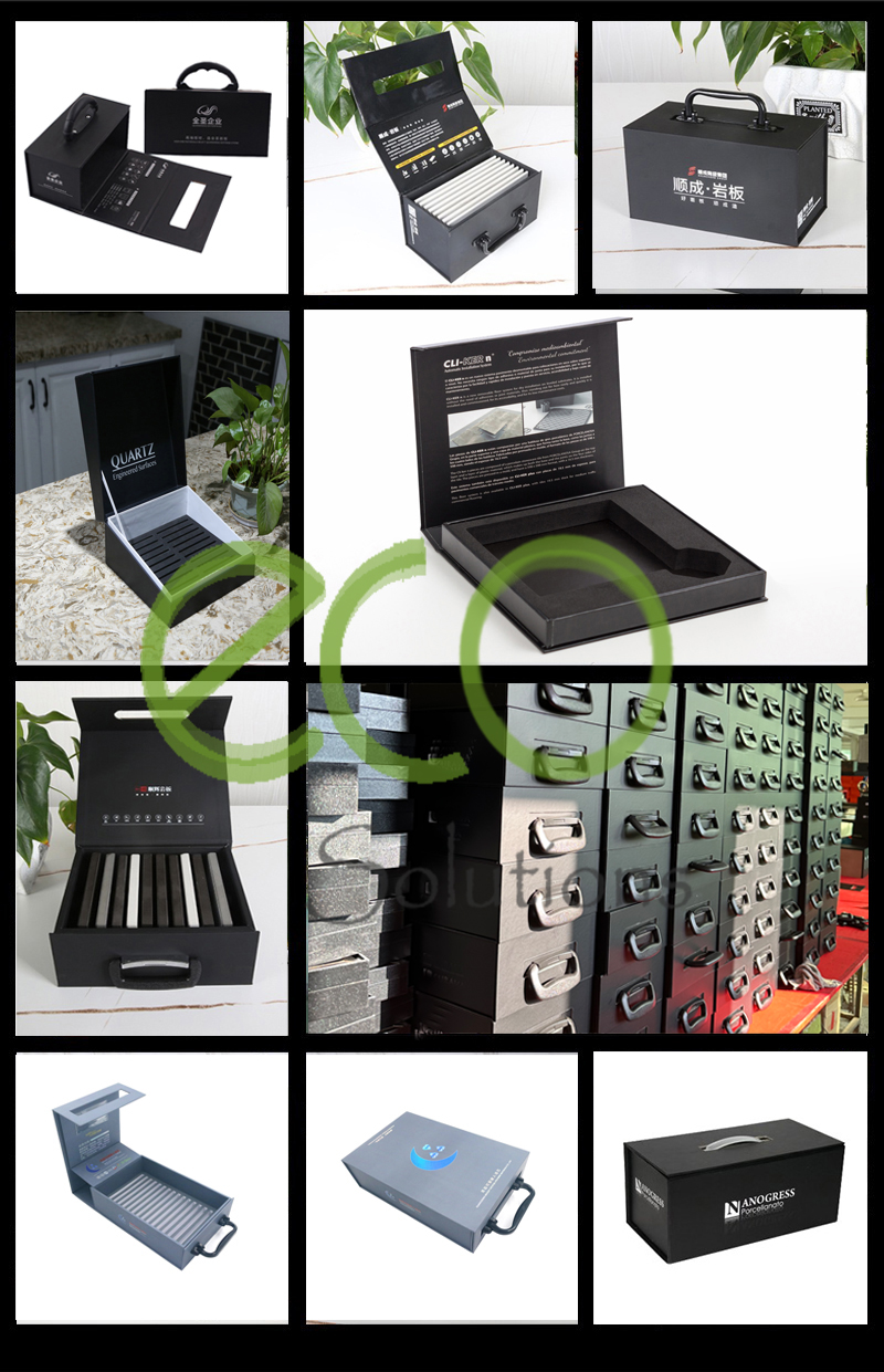 Sample display Boxes for Granite Marble Quartz Stone Porcelain Tile made of Cardboard , inside with cut-into size foam EVA or PE Foams are perfect for building material product sample presentation. Such as Granite, marble,quartz stone, porcelain tiles, wood flooring tiles, wooden products.