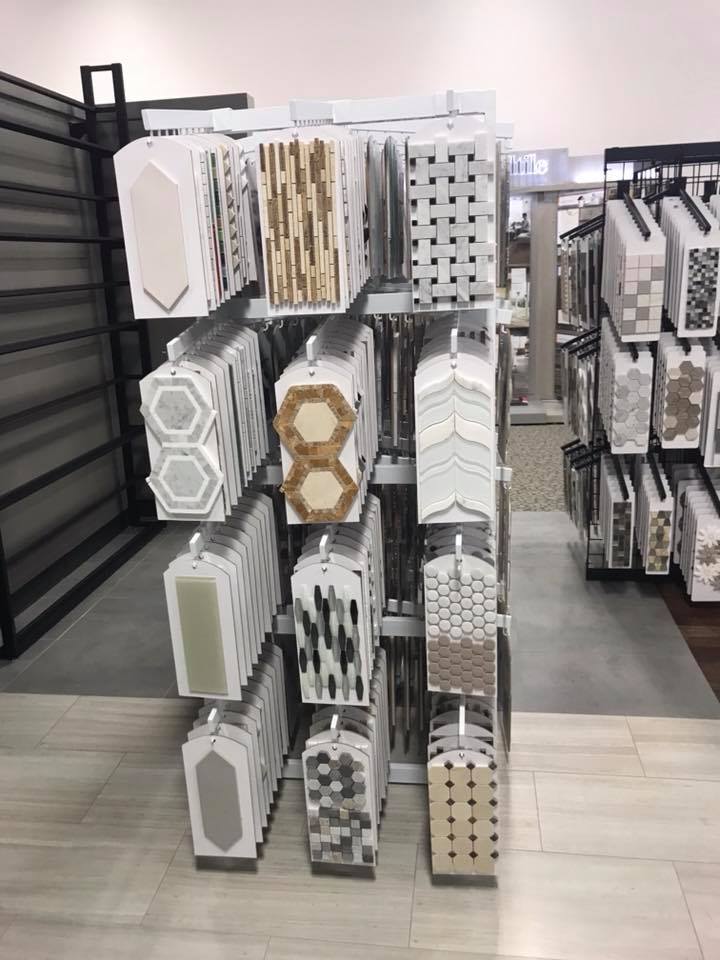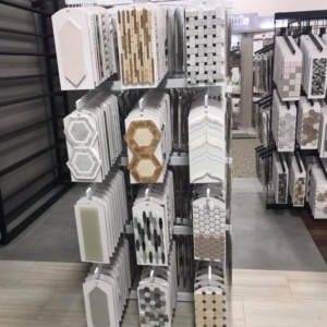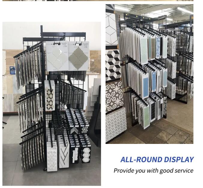 This display shelf stand made of metal structure with hanger to hook sample boards is perfect for glass mosaics, ceramics, tiles, flooring ,stone sample display in the showroom. We create showroom tile display rack systems according to your product sample dimentions.