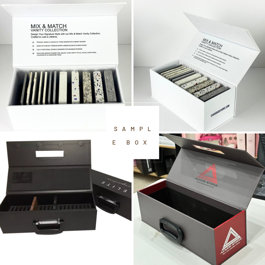 These Stone Sample Display Boxes are commonly used by architects, designers, and homeowners to select and compare different quartz , tiles, flooring samples for use in flooring, countertops, and other applications.