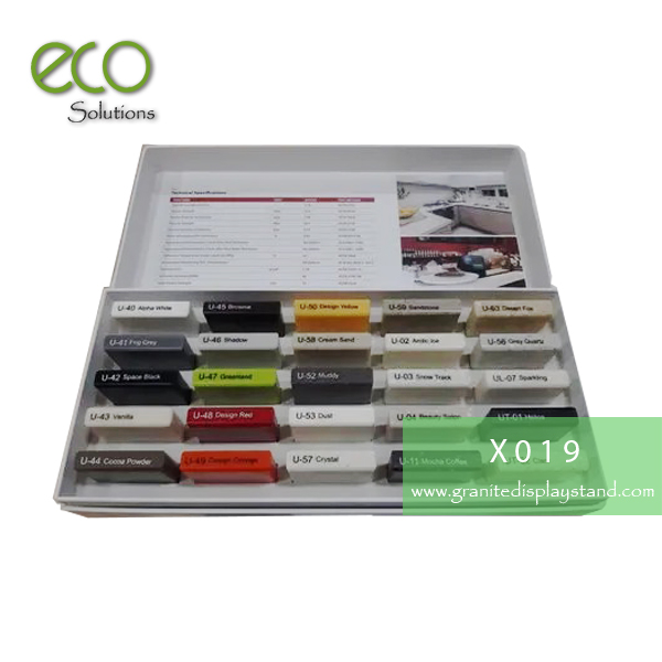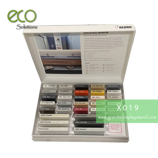 Eco sample display design and produce sample boxes, sample cases for building material sample chips, such as granite samples, marble stone samples, quartz stone samples, tile samples, flooring sample chips.