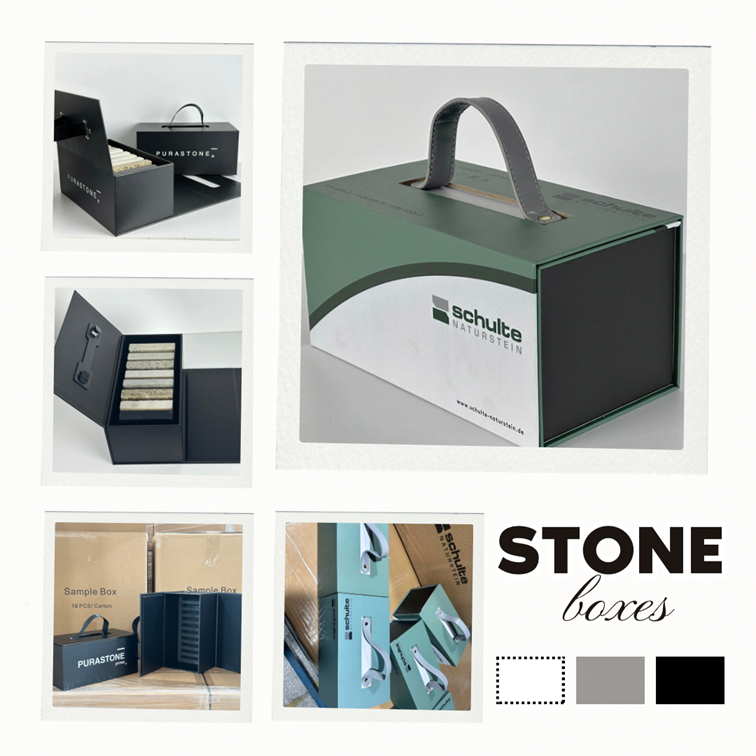 This stone sample box made of 3mm cardboard panel which is rigid display case. We will design a 5mm EVA foam in the four sides of this stone sample box to protect damage by holding granite, marble, quartz stone samples.