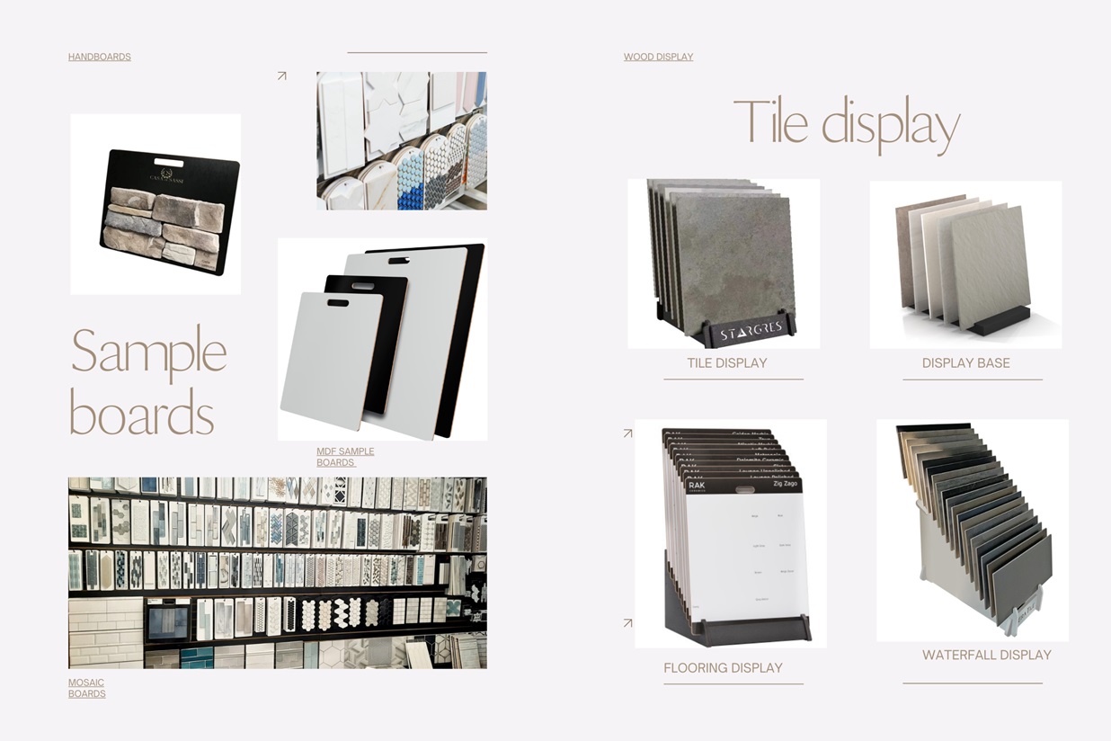 We manufacture Stone Display Racks,quartz stone counter displays, tile displays, mosaic display stand, Tile sample books, stone sample boxes, tile sample boards, tile swatch boards, according to your sample size and thickness.